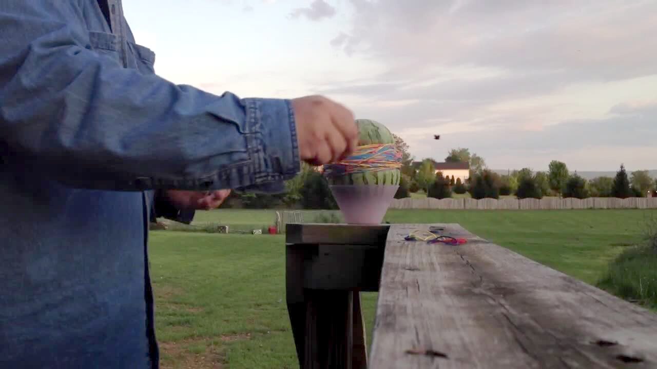 A man and girl stretch rubber bands around a watermelon outdoors and at 1:30 it starts to crack and explodes.