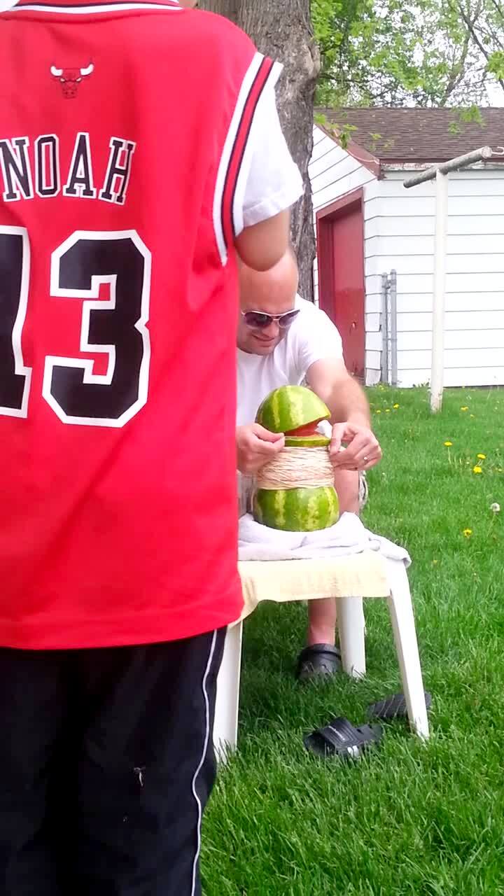 A man and a young boy put rubber bands on a watermelon until it explodes in slow motion.
