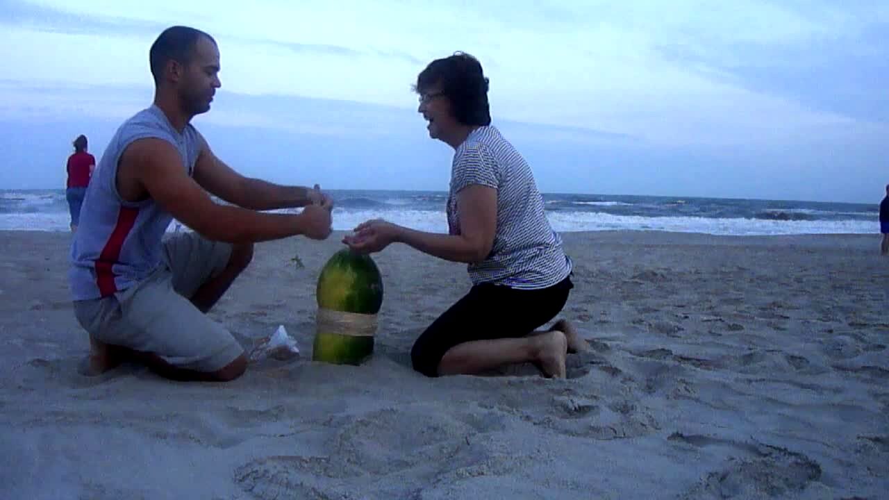 A man and a woman wrap several rubber bands around a watermelon on the beach. It explodes and hits the woman in the face at :14.