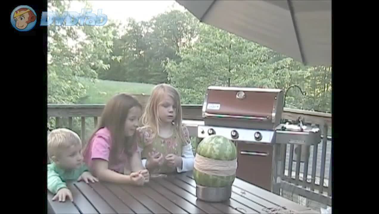 Two men put several rubber bands on a watermelon while two young girls and a boy watch. It explodes at :17 and everyone cheers.