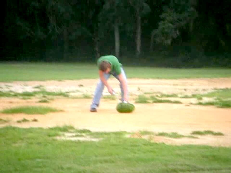 Two men stretch rubber bands around a watermelon as a girl watches and laughs. At 3:10 the watermelon explodes after 426 rubber bands. The clip plays again in slow motion