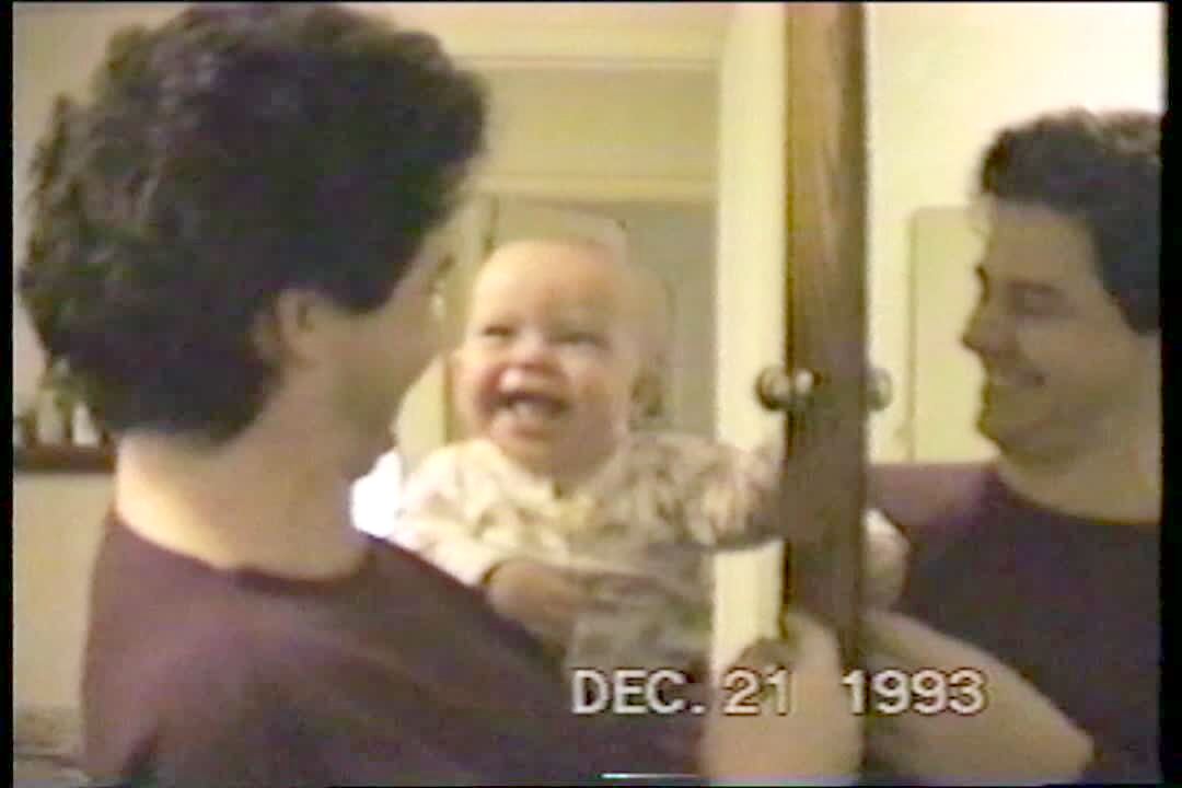 A woman plays with a baby boy and makes him giggle then asks him, "do you think mommy's funny?" He says, "no."