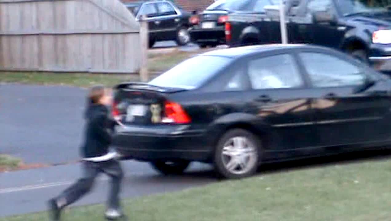 Teen boy runs on an outdoor track dragging a parachute behind him for resistance. The parachute hits and knocks over a teen girl running beside the track. Short tails.