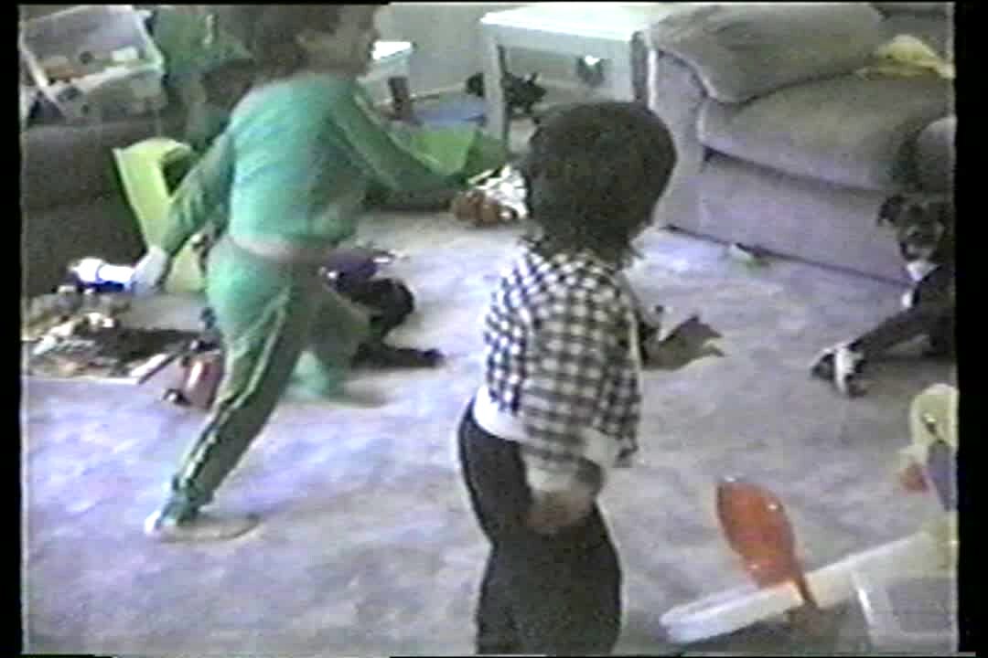 Two young boys dance along with a song. The taller boy accidentally kicks his brother in the face.