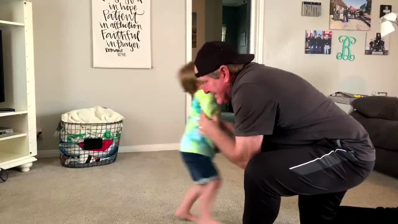 A tot boy and his grandfather play fight in a living room as they pretend to punch each other. The man tells the boy to punch his stomach, the boy does then kicks him in the groin and he falls over.