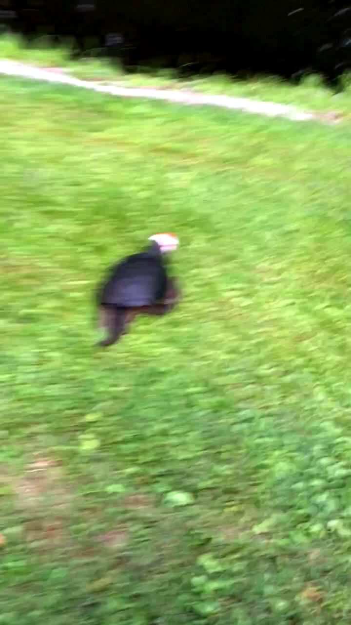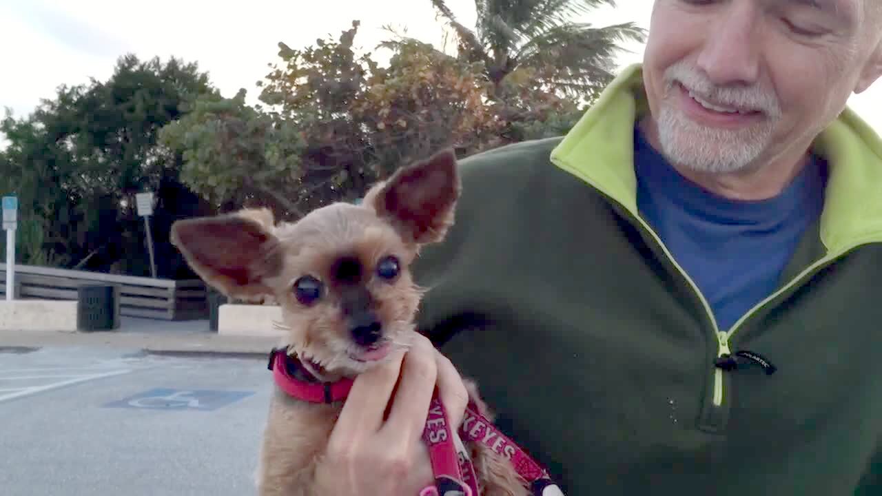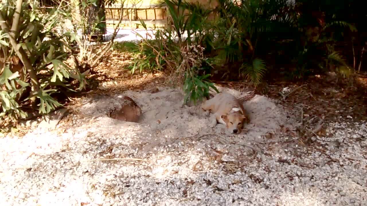 Two dogs play with a ball outdoors. The yorkie dog takes the ball while the beagle dog isn't looking. The beagle searches for the ball.