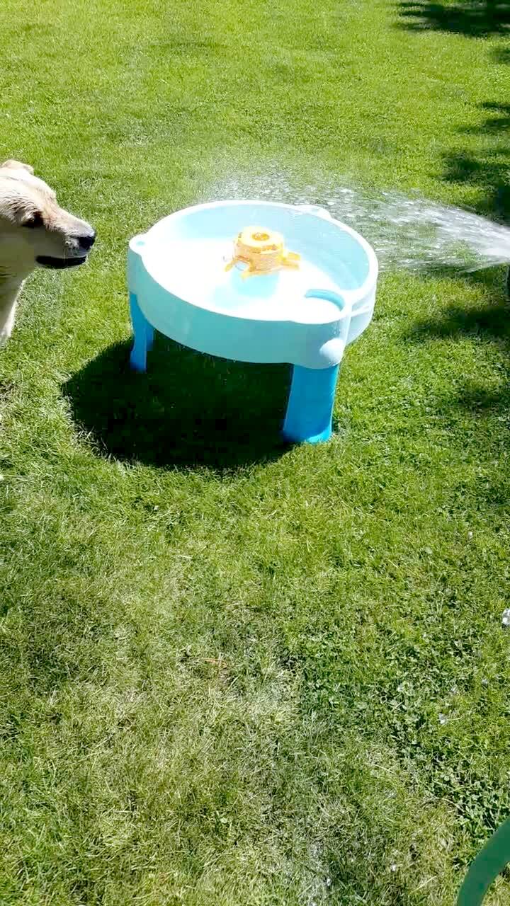 A dog runs and jumps in front of a hose repeatedly as another dog drinks water from it outdoors.