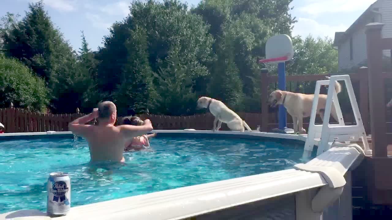 A dog walks on the edge of an above ground swimming pool and slowly falls to the ground.