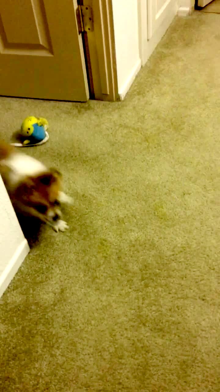 A Boston Terrier dog's lips move every time someone squeezes a dog toy and it squeaks.
