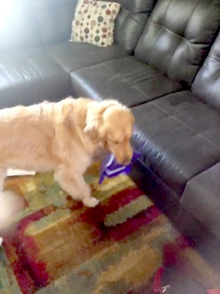 A teen girl jumps on an air mattress indoors and her dog flies into the air. Slow motion.
