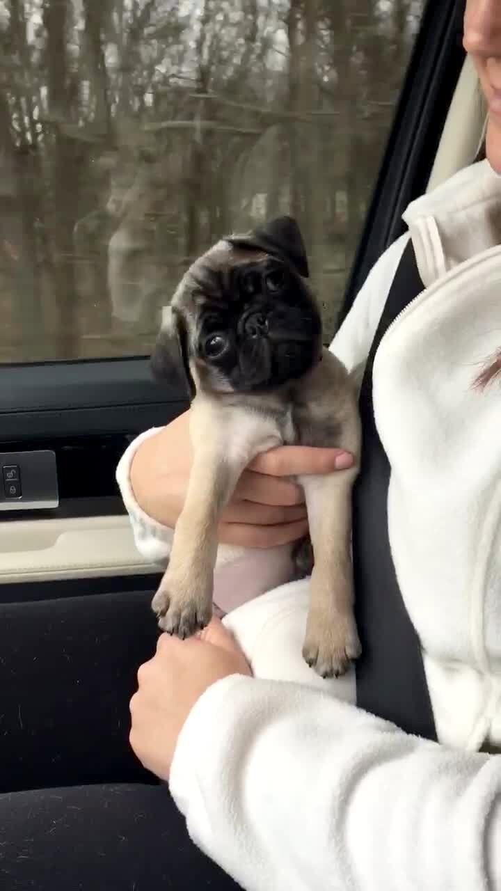 A pug puppy dog turns his head back and forth as person off camera whistles in a car.