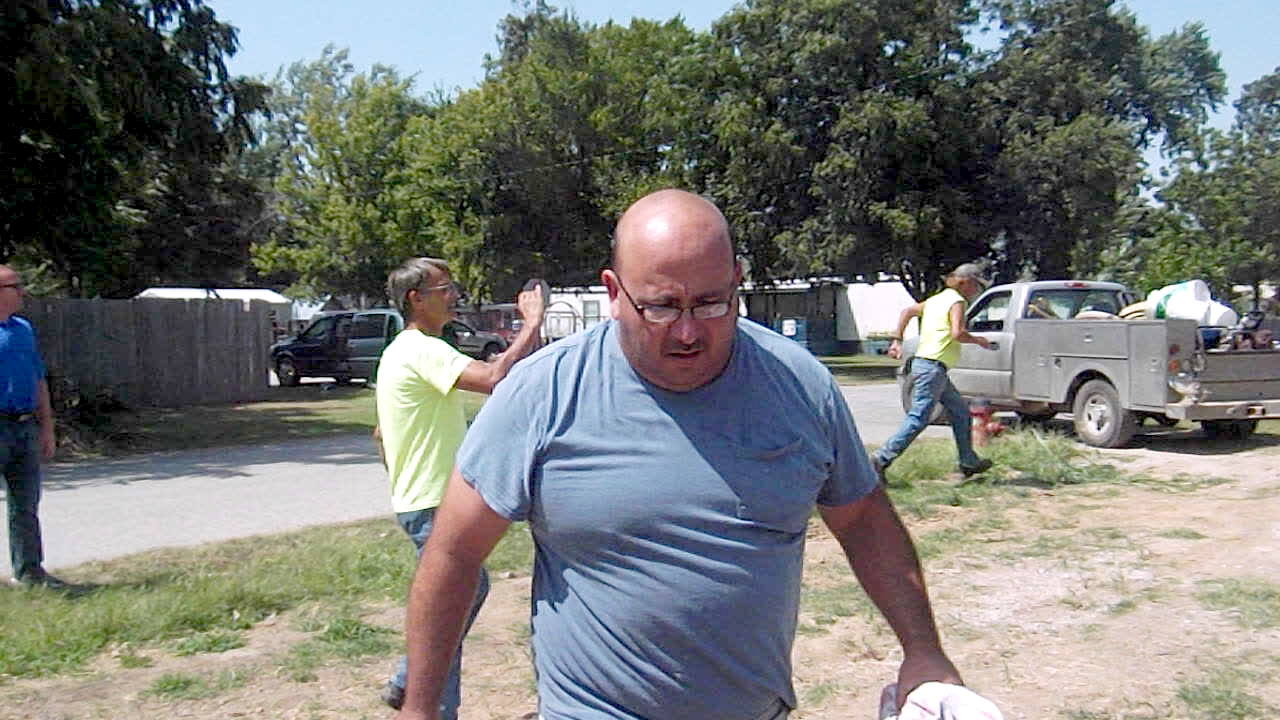 Toddler boy plays in a wading pool, he dives in. Grandpa gets in and falls on his butt. Mishap