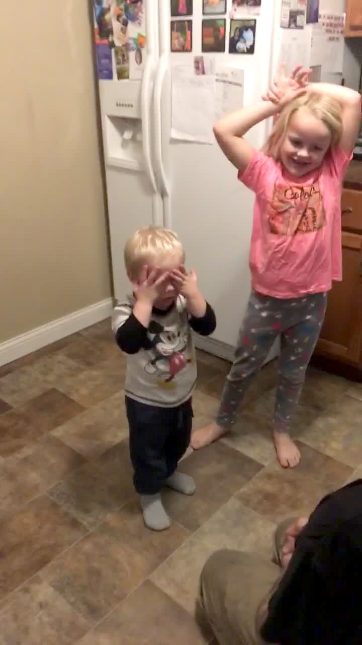 Dad on motorbike rides up a ramp on the street and falls off. With recovery. Kids laugh. (2103)