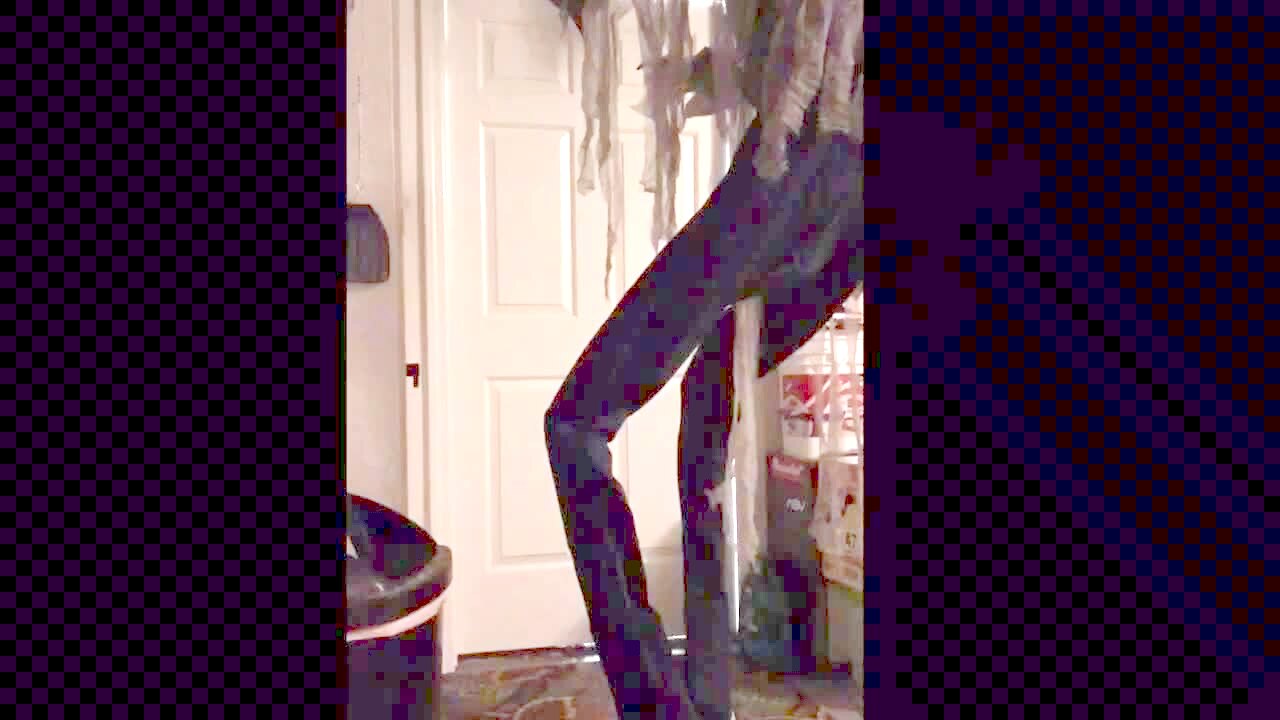Dog stands on back paws at door and appears to be dancing to salsa music. Montage maybe.