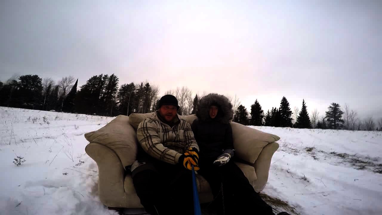 Teen boy stands on a large concrete structure by a snow covered hill with an inner tube. He jumps off, lands hard, flips over his sled, crashes on the hill, and slides down.