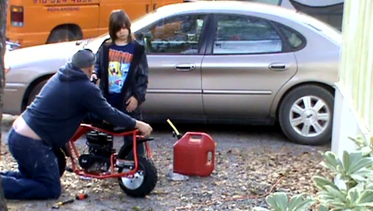 Boy sits on a small dirt bike in a front yard after a man turns it on. The boy rides across a road and crashes into a parked car in a driveway. Short tails.