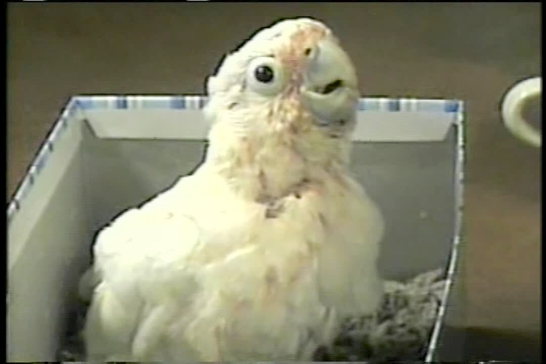 A white bird has its top feathers fluffed out as it barks like a dog. Woman says bird is a good watch dog