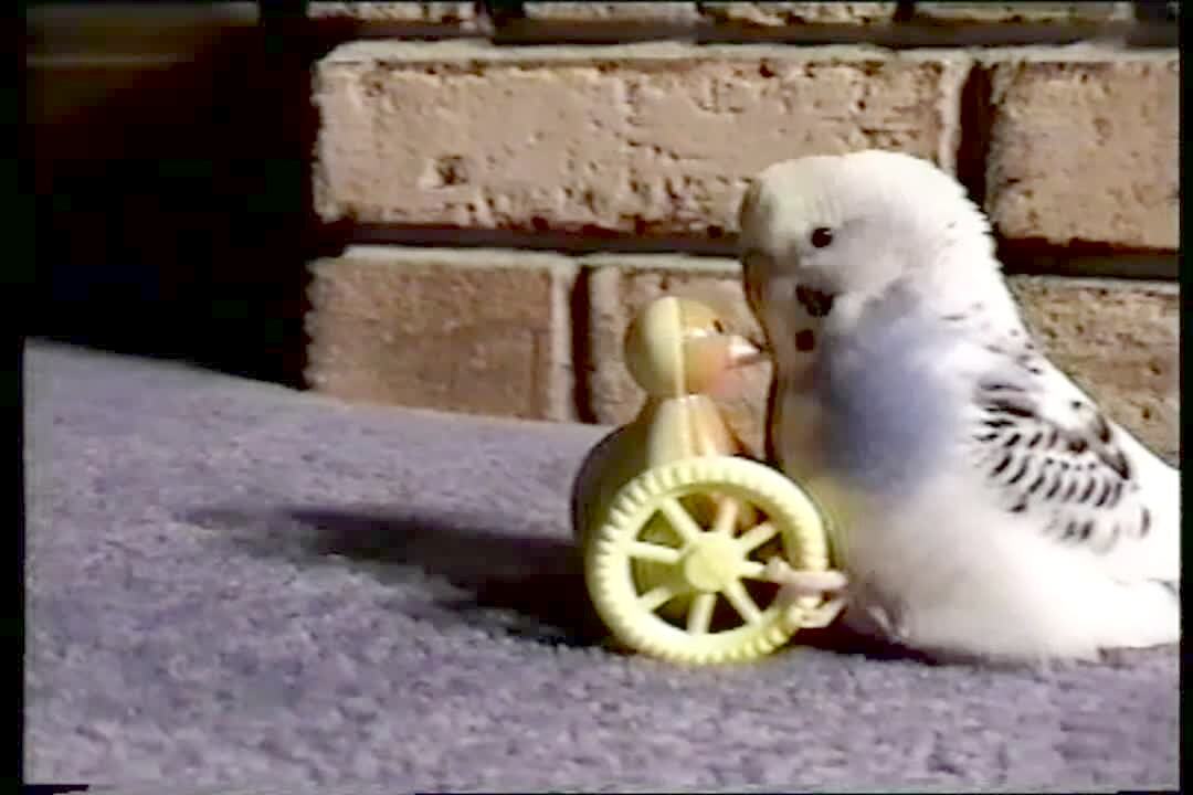 Parakeet argues with toy bird