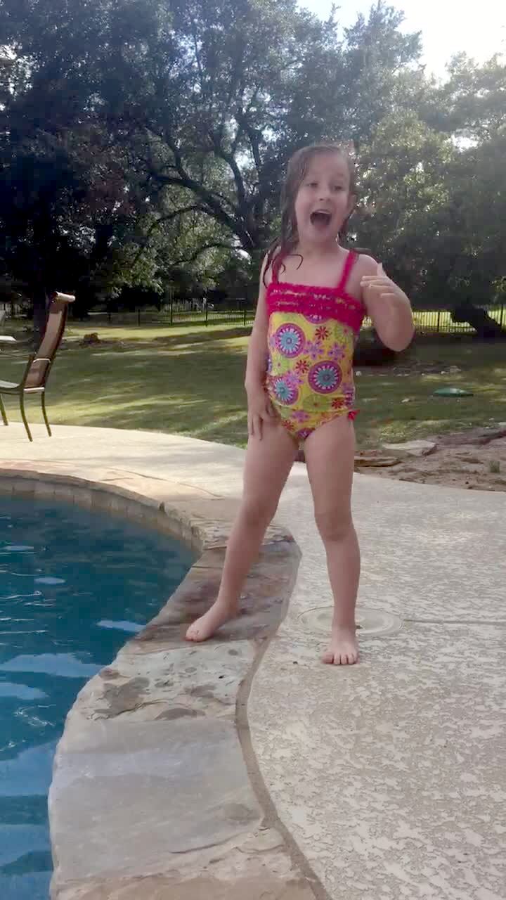 A young girl falls in a swimming pool while she talks to the camera about jumping in the water.