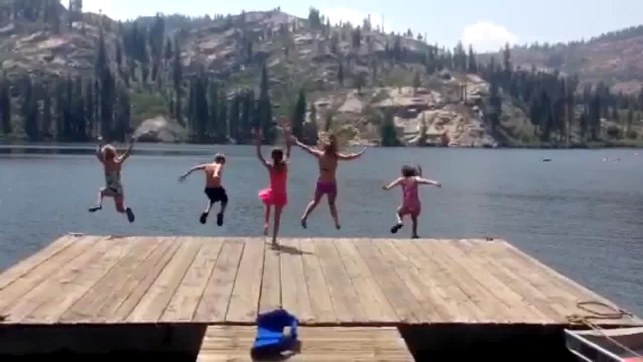 "Tremendously Timed Trick Shot" A teen boy on a trampoline throws a ball to a group of teen boys next to a pool, who throw it from one to the other as they all jump in the pool, before one dunks the ball in a mini hoop, outdoors. AA: Basketball Trick Shots.