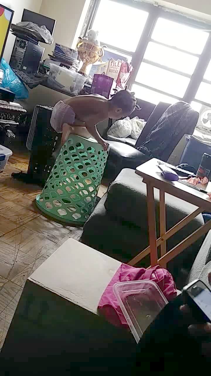 Tot girl falls head first into the laundry hamper and can't get out. Her legs are straight up in the air when her dad and mom find her.