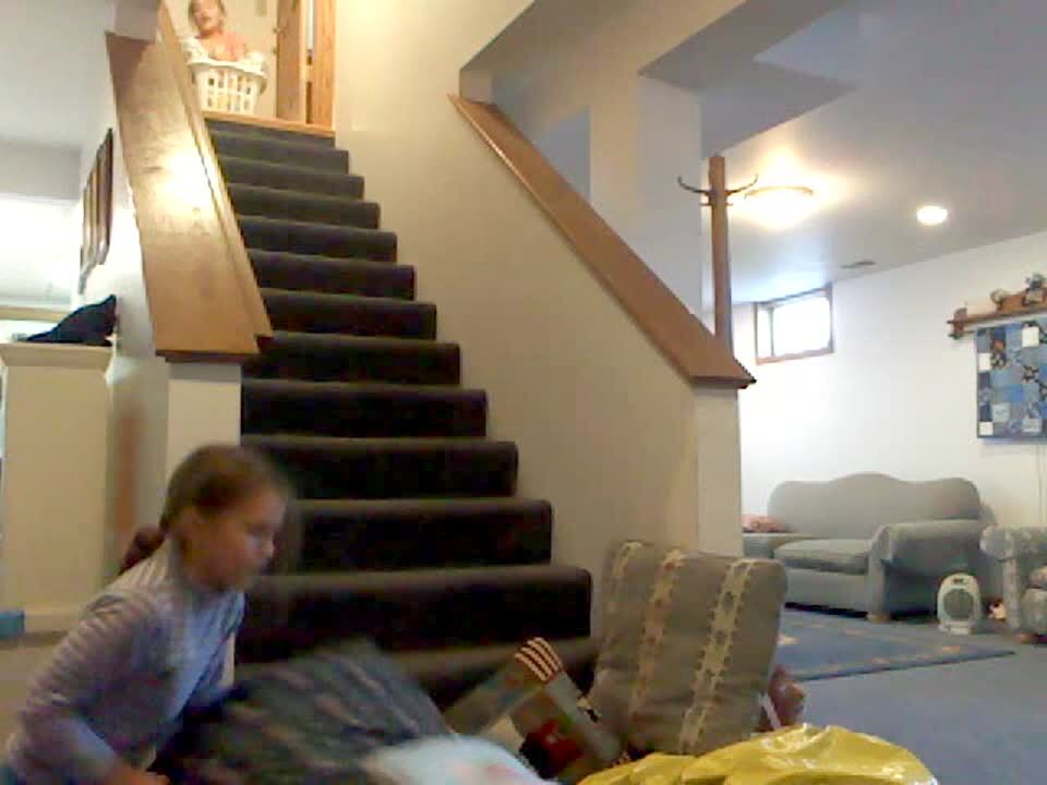 A girl sits in a laundry basket at the top of a flight of stairs. She slides down the stairs, falls out of the basket, and tumbles hard down the stairs. Action 1 minute to end.