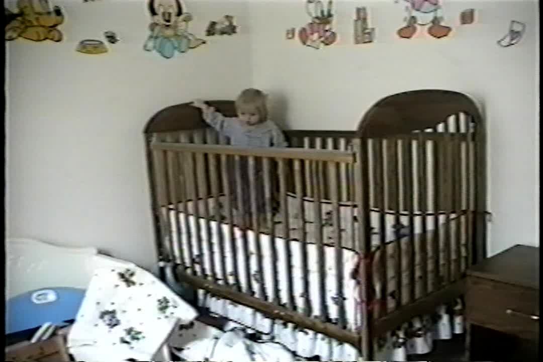 Tot girl jumps out of her crib after she throws everything in it out onto the floor.