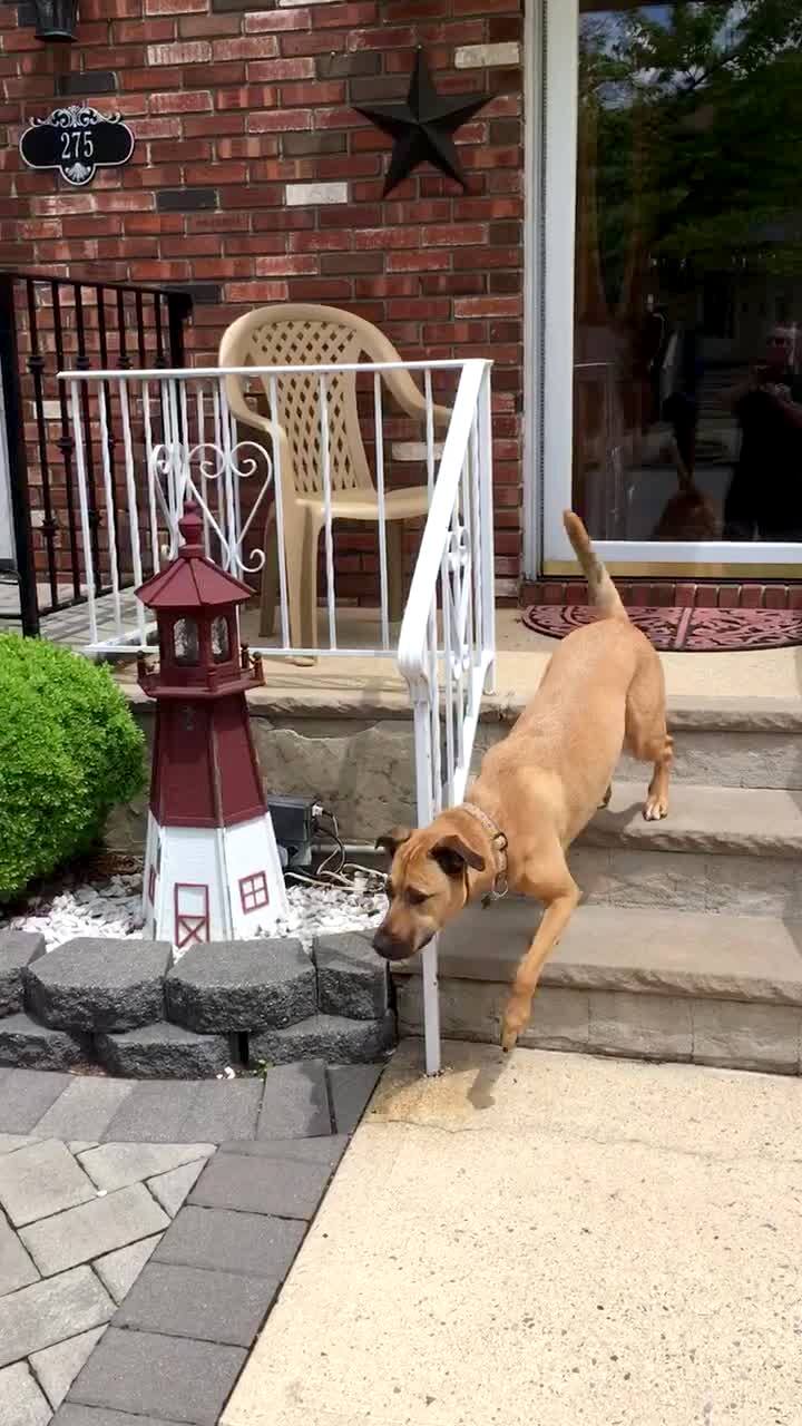A man builds a dive board out of a ladder and a plank of wood, then falls into the backyard swimming pool when the plank breaks.