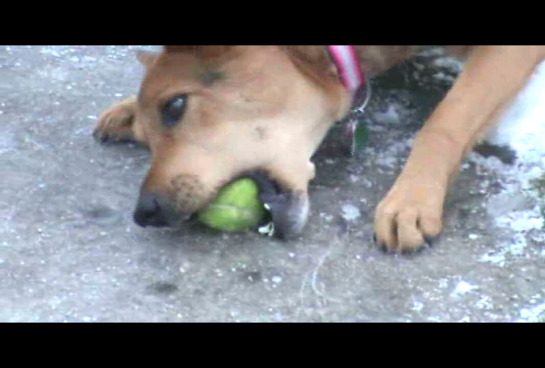 Dog finds a ball in the snow but it's frozen to the sidewalk and dog can't pull it off.