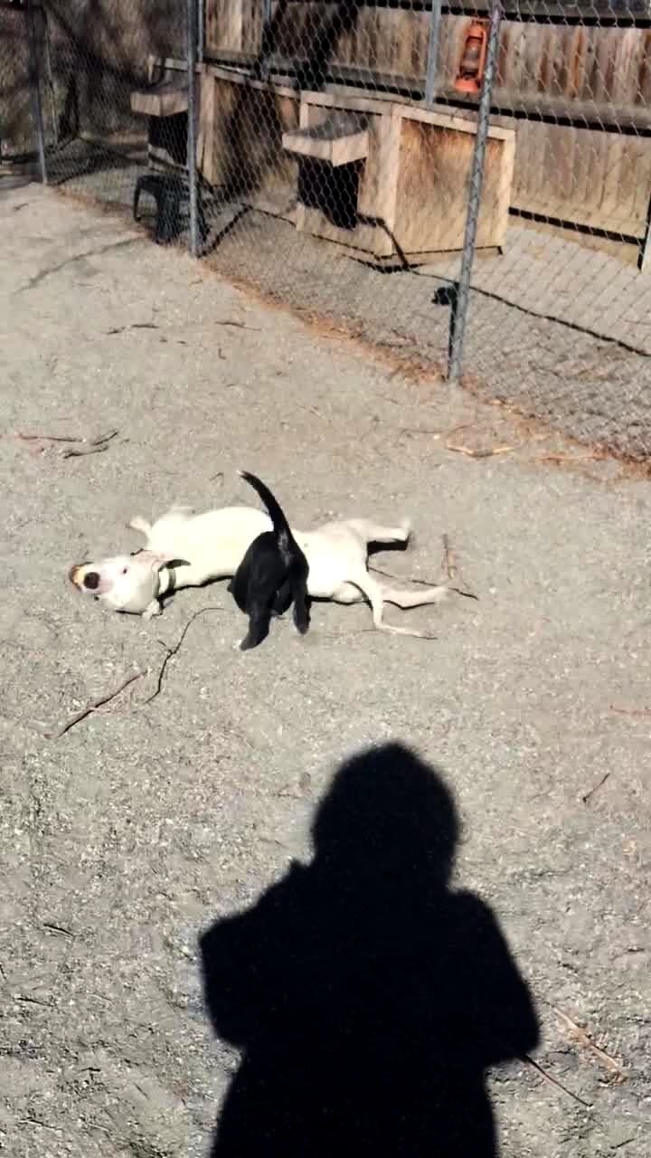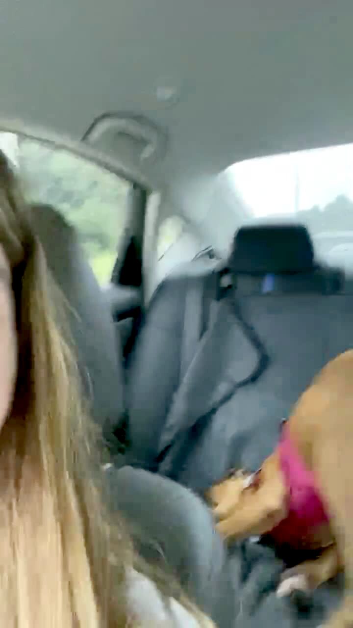 A woman drives a car and a teen girl records a video of a boxer puppy dog in the back seat the is stuck upside and rolls over to sit upright again and they laugh.