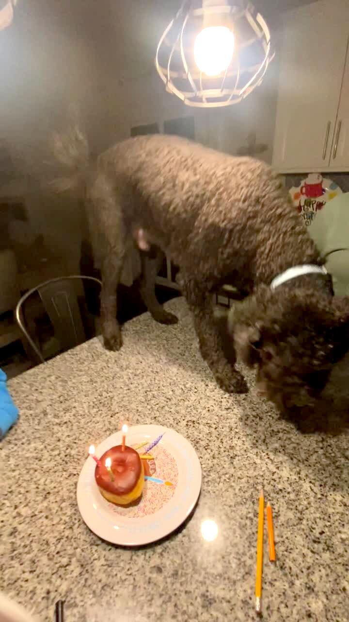 A dog jumps up on a kitchen counter and eats his birthday doughnut with lit candles in it.