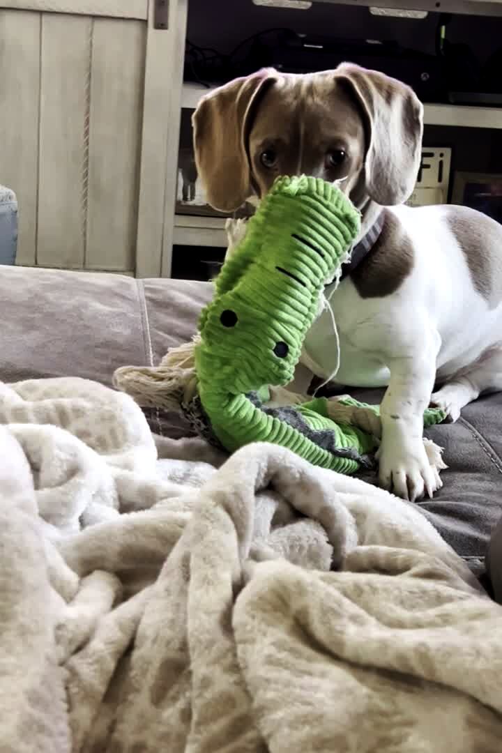 A woman asks her dachshund if his face is stuck inside a toy in a living room, then the dog turns to look at her with the toy around his snout.