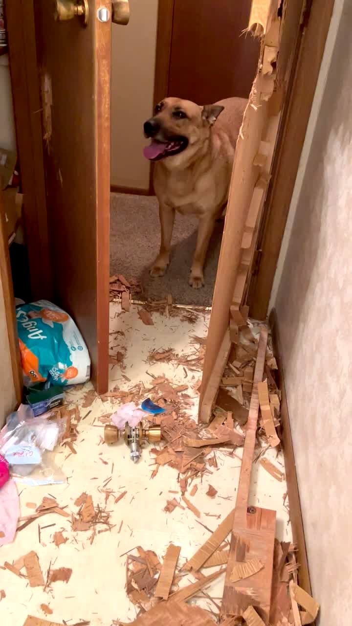 Aftermath of a dog that chewed up a door after getting trapped in bathroom.