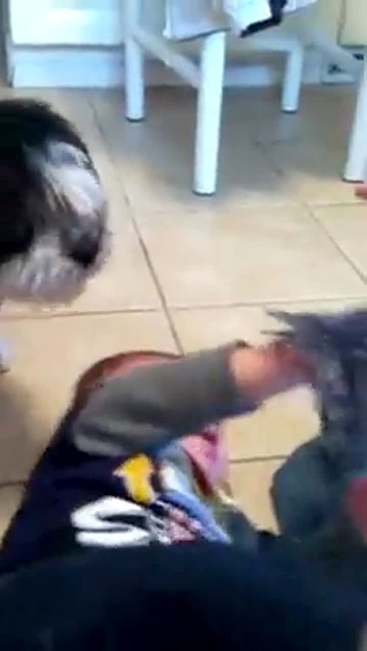 A young girl gets dragged down to the floor by her pants as her dog yanks at them.