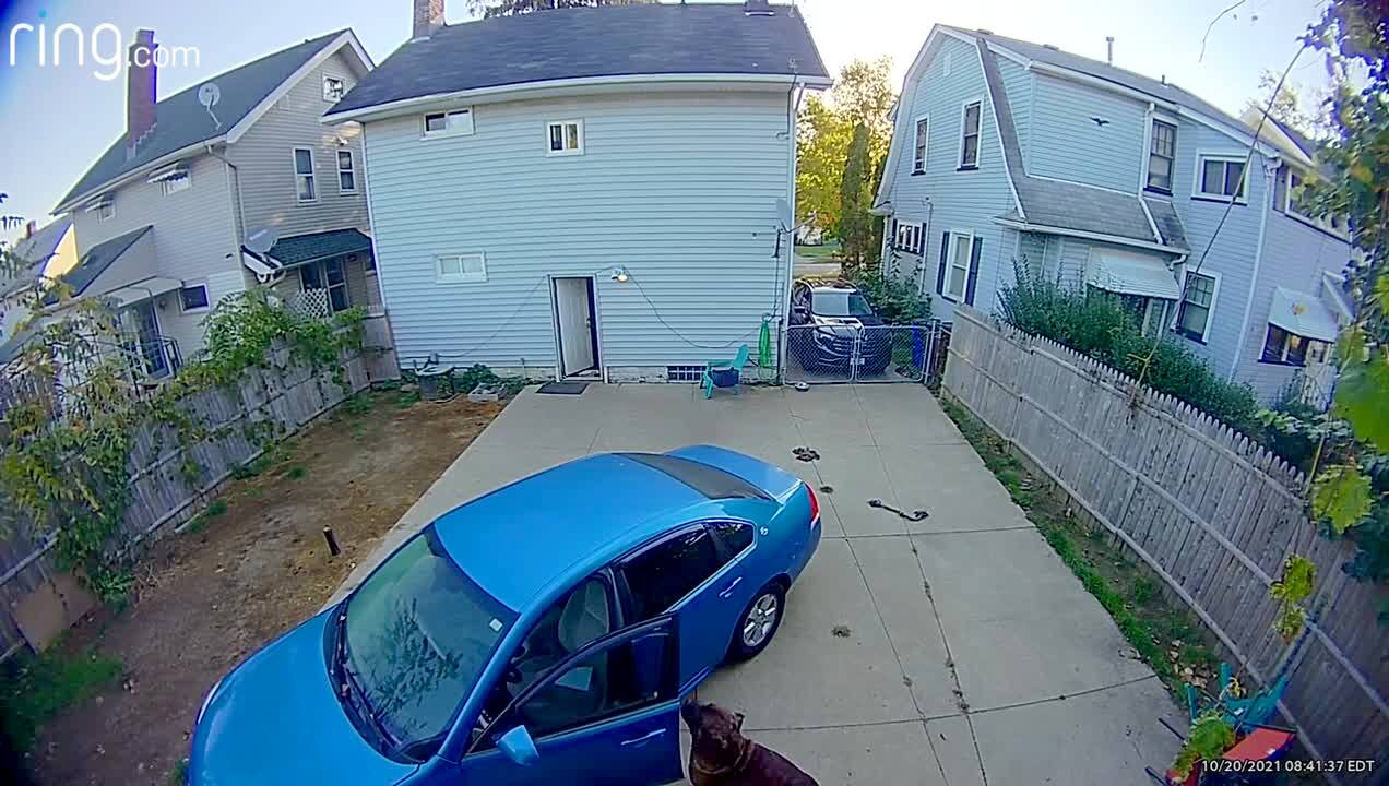 A dog opens a car door with his mouth and traps itself in the cab of the vehicle in the backyard. Ring.com. Security footage.