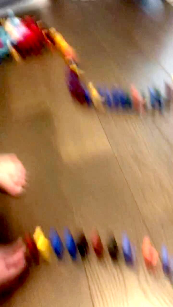 A young boy yells, "No" in the living room when his dog knocks over a line of dominoes as she sniffs it before he can do it himself.
