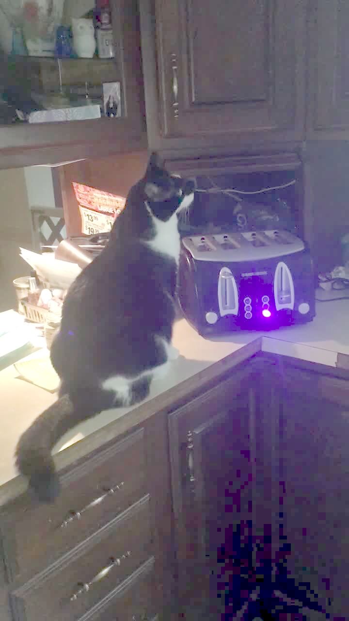 A cat sits on the kitchen counter next to a toaster and gets scared when toast pops out of it. The cat jumps off the counter and knocks other items off as well.