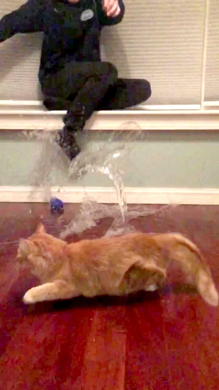 A man lets go of a water balloon next to a cat and when it pops on the floor, the cat shuffles his paws against the floor as he runs away in slow motion. AA: Super slo-mo water balloons.