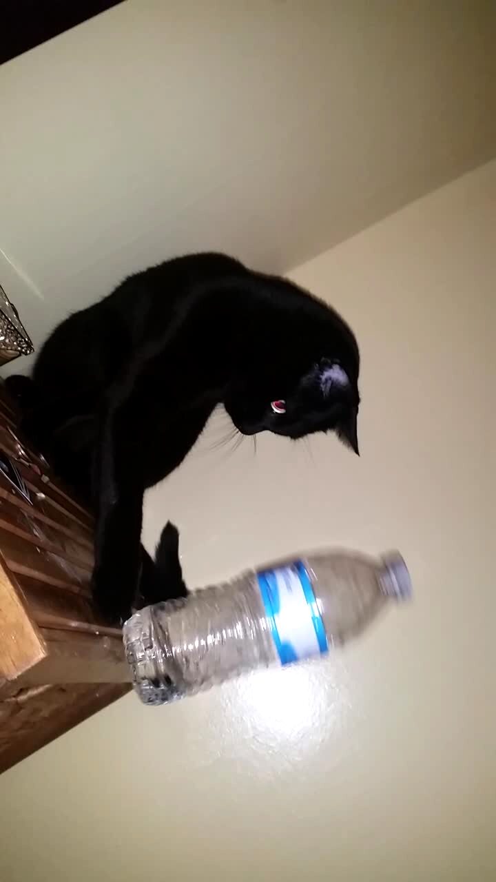 A cat pushes a water bottle off a table even when his owner tells him not to.