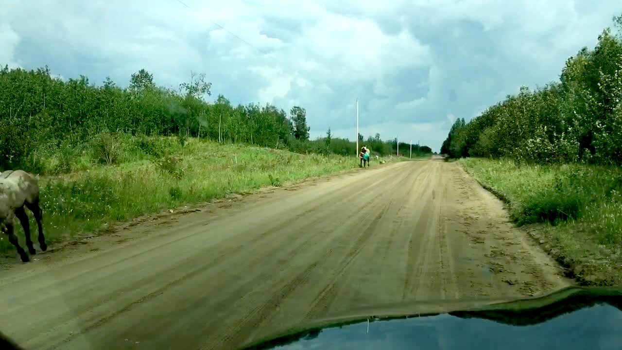 Horses run along the side of a road. The last horse has a toy car stuck around its neck.