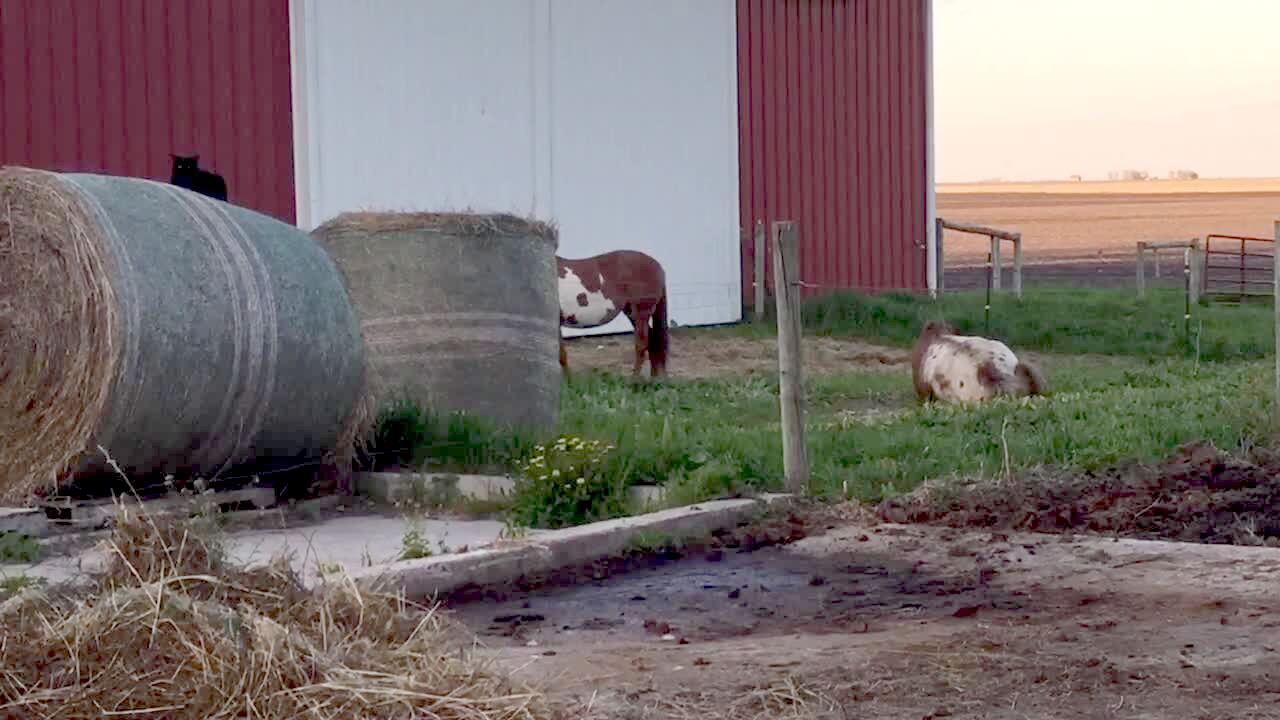 A horse rolls in the grass outdoors before he jumps in the air and farts in the direction of the other horse next to him.