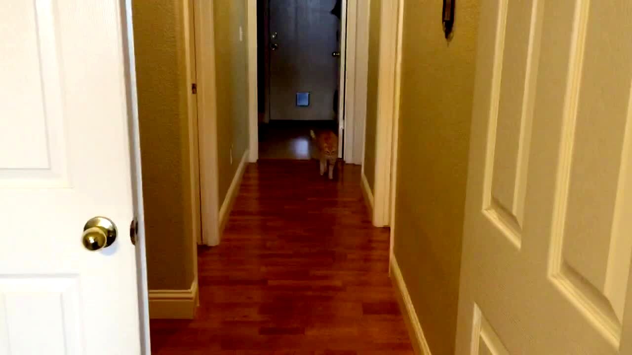 A cat walks down a hallway indoors when a man jumps out in front of it and screams to scare the cat away.