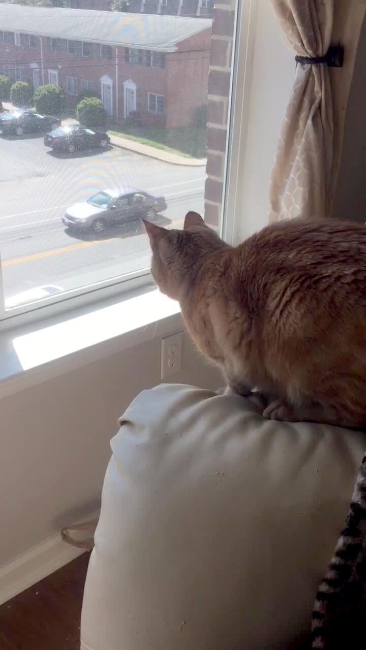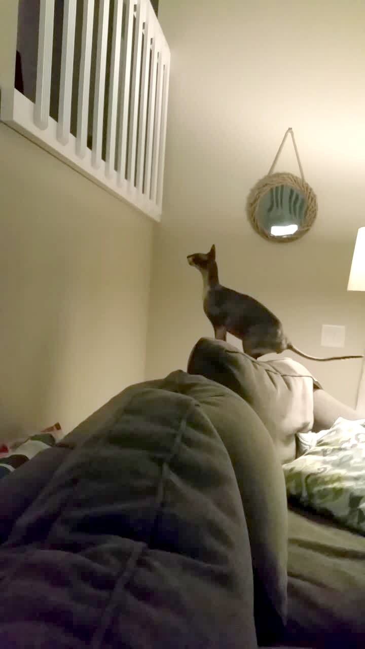 A cat stands on a couch in the living room and gets ready to jump up to the loft and slips when it jumps and falls behind the couch.