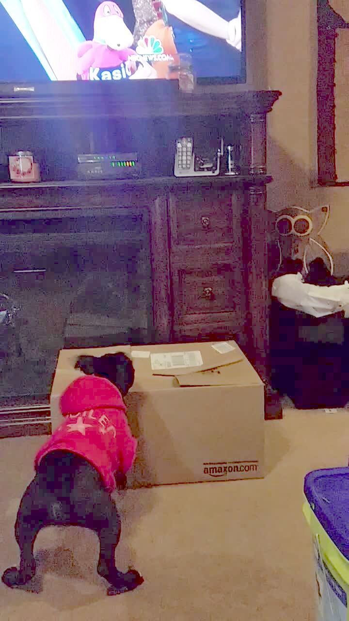A puppy dog barks at a cat hiding in a box indoors and each time the cat pops up, it scares the dog. The cat jumps out and the dog growls.