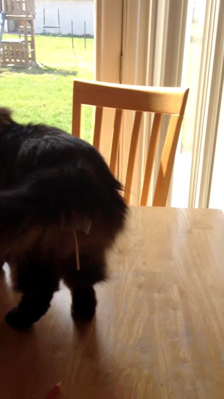 A cat walks indoors with a lollipop stuck to his butt under his tail after he sat on it.