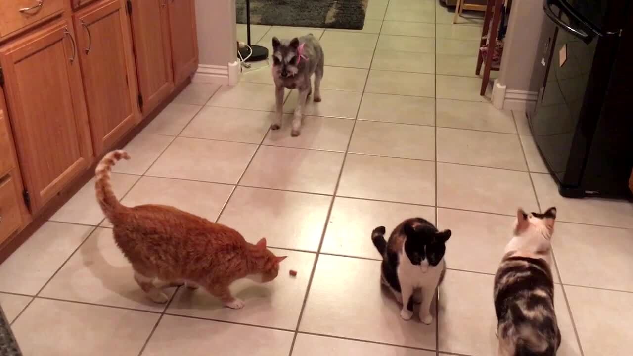 A Schnauzer dog slowly approaches a treat on the floor next to three cats and once he grabs the treats, he quickly retreats backwards to the rug behind him.