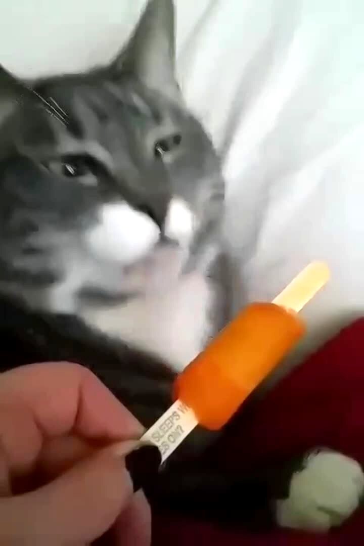 A cat licks a popsicle and then licks the air repeatedly indoors.