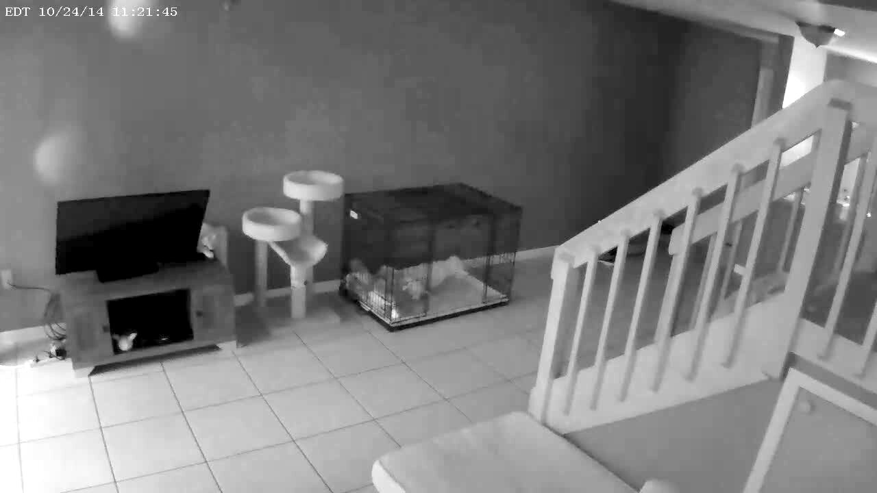 In black and white security camera footage, a white cat runs at a TV on a coffee table indoors and knocks it over before running out of the room.