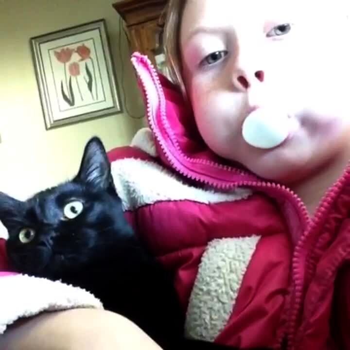 A young girl blows a bubbles with bubble gum indoors and a cat pops it with its paw. It then scratches the girl's face.