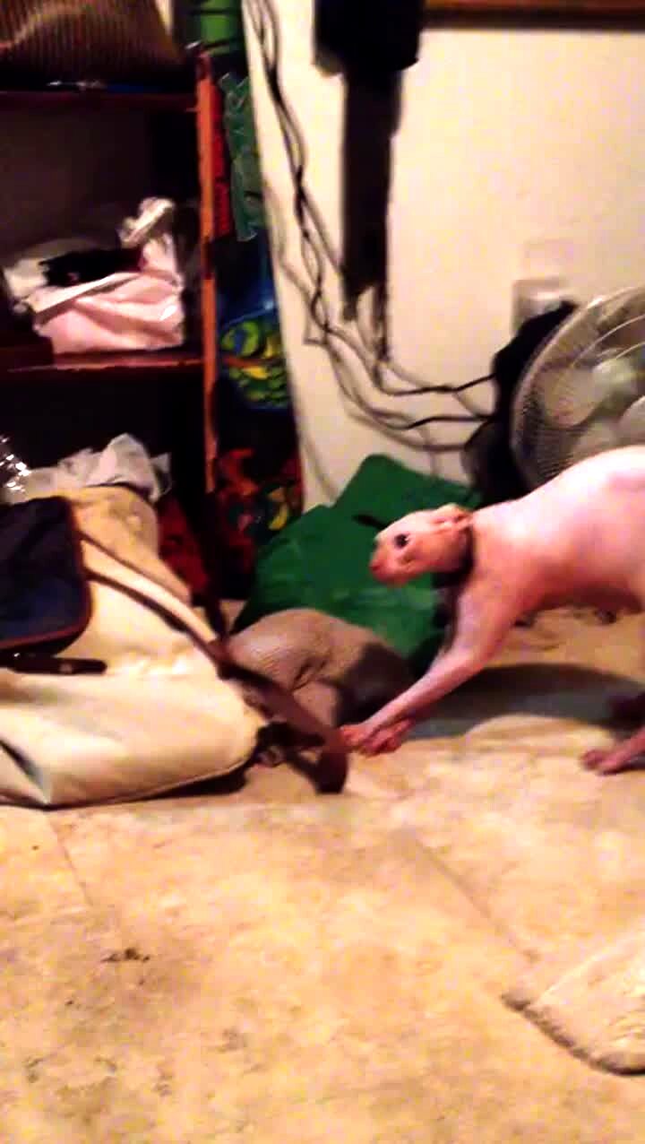 A hairless Sphinx cat stands with his ears back and his back arched indoors as a man wearing a Halloween wolf mask crawls toward him indoors. Each time he gets closer, the cat growls and hisses.